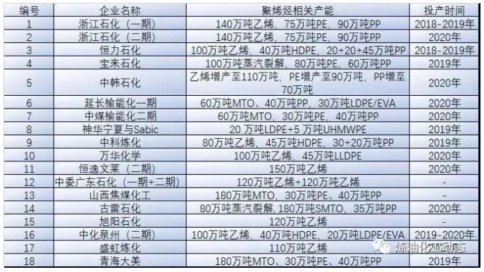 萬(wàn)華化學(xué)35萬(wàn)噸/年HDPE(Hostalen ACP)、45萬(wàn)噸/年FDPE(Unipol)、30萬(wàn)噸/年P(guān)P(Spheripol-Ⅱ)計(jì)劃于2020年三季度陸續(xù)投產(chǎn)。