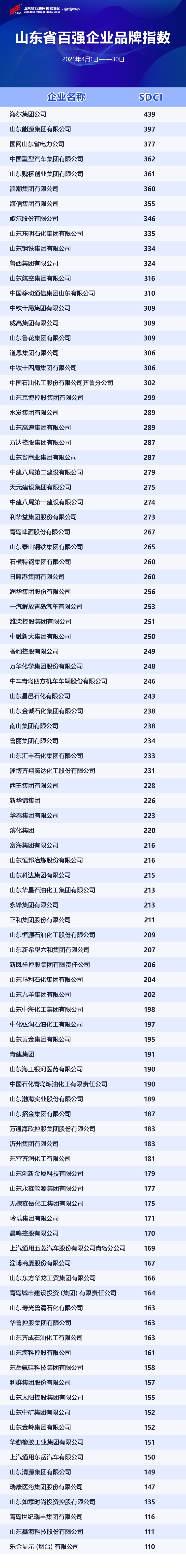 由山東省互聯(lián)網(wǎng)傳媒集團輿情中心編制的山東省百強企業(yè)品牌指數(shù)(4月份),日前正式發(fā)布。在4月份榜單中,海爾集團、山東能源集團、國網(wǎng)山東省電力公司、中國重汽集團、魏橋創(chuàng)業(yè)集團、浪潮集團、海信集團、歌爾股份、山東東明石化集團以及山東鋼鐵集團位列前十位。
