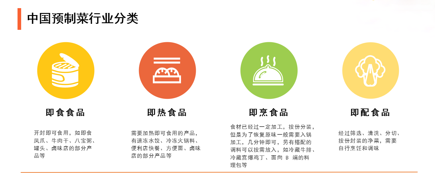 預(yù)制菜一般是指將各種食材加工制作為成品或半成品,經(jīng)簡(jiǎn)易處理即可食用的便捷風(fēng)味菜品。目前市面上的預(yù)制菜可以分為即食食品、即熱食品、即烹食品、即配食品四大類(lèi)。